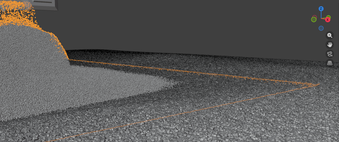 To smooth out the boundary between the actually simulated material and the static floor, we can add another “fake” surface. That surface has some purely geometric cubes scattered on it with the same look as our simulated ones.