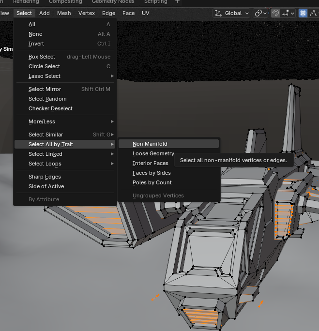 To inspect the mesh, we can use this select non-manifold operation: