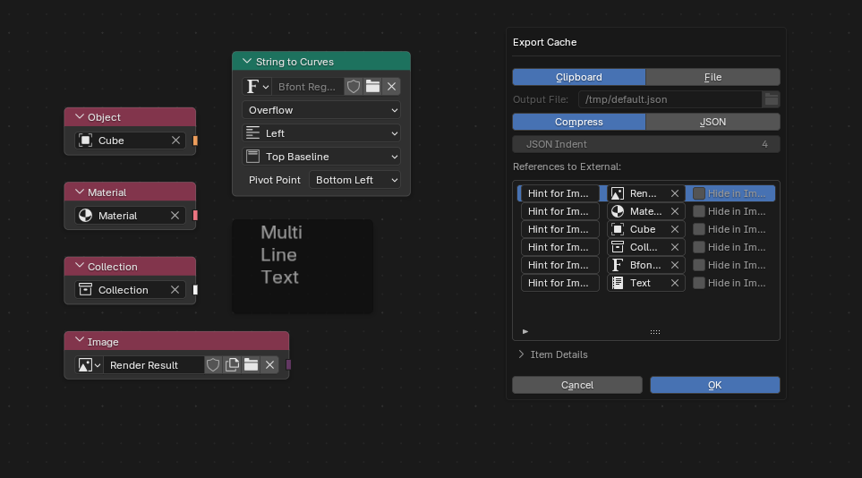 From my perspective, a software developer’s perspective, this is already ample motivation. But wait, there’s more: It’s actually really easy to go from JSON to a compressed (Base64) string and back! This provides a convenient way to share that is useful for any Blender node tree user. (Not only add-on devs)