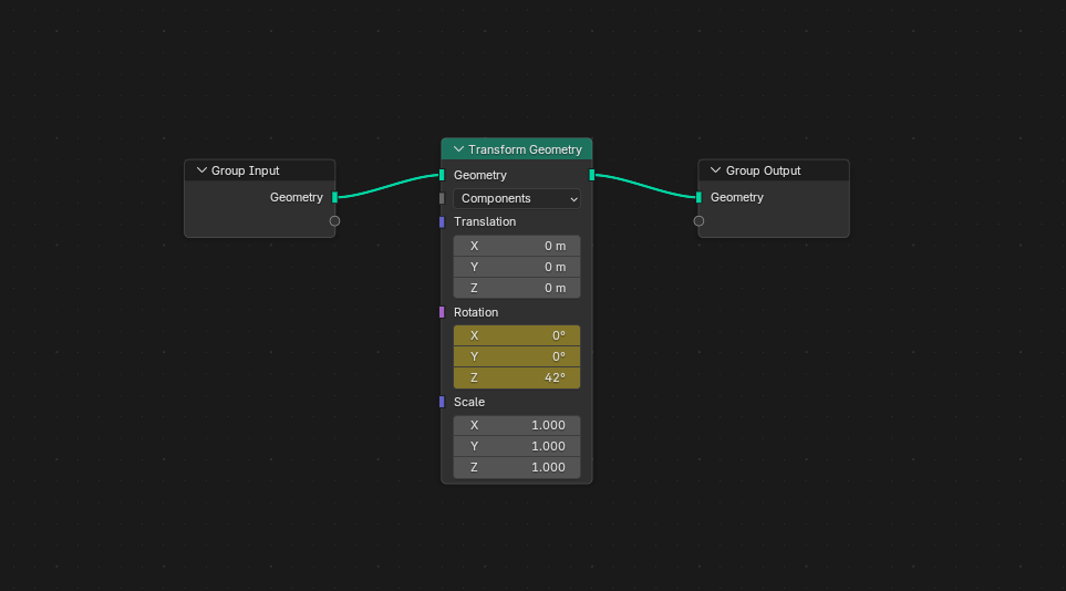 The Rotation socket in this Transform Geometry node is animated, but Tree Clipper will export whatever its current value is.