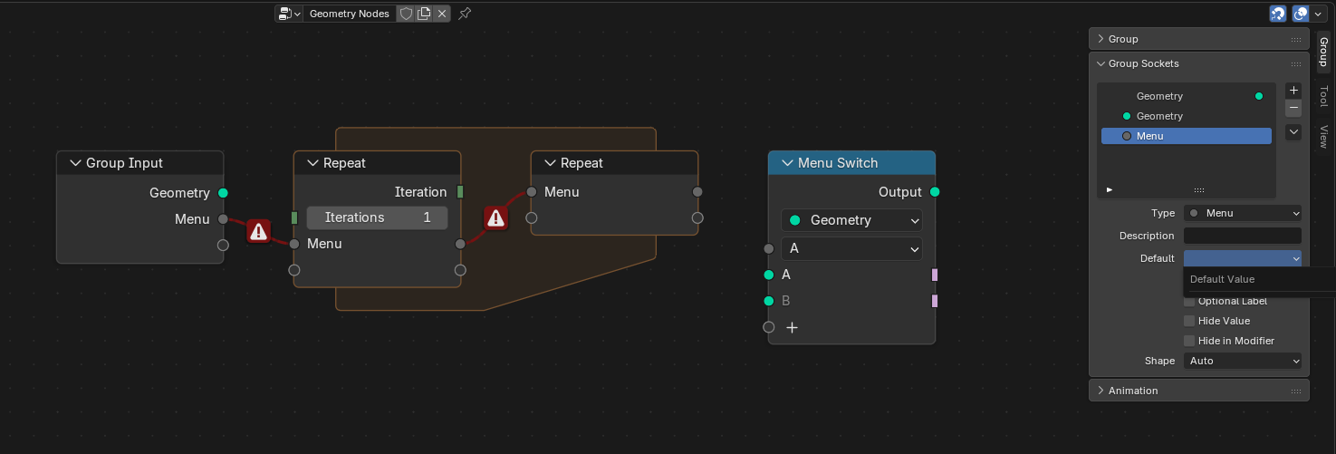 - Import all the nodes, including their properties, so that the right side of the “Repeat” zone has a “Menu” entry and the “Menu Switch” has the enum variants. The sockets are implicitly created.