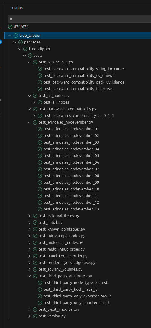 We have generated tests, round-trip tests for really complex setups from community .blend files, and tests for specific bugs we’ve found and fixed.